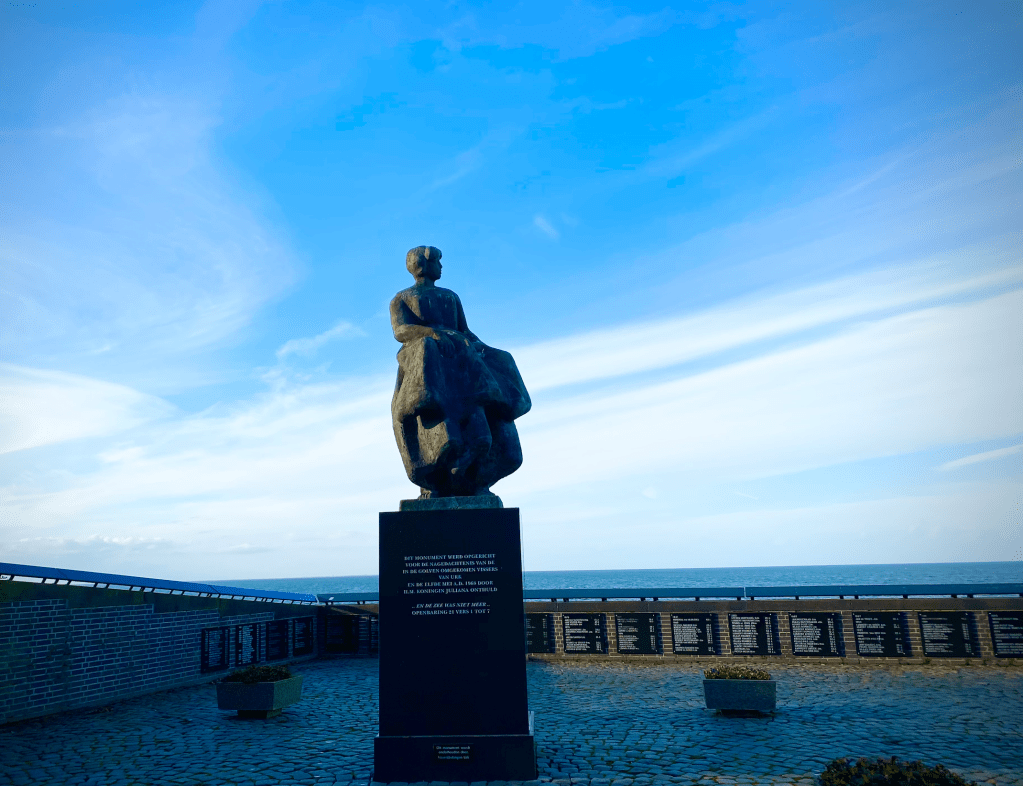 Walking through the streets of Urk, admiring the beautiful houses and enjoying the quiet street until we reach the Memorial site to those lost at sea. The landmark isn’t only the sculpture, but has plaques with the full names of deceased fishermen with their year they died and the age they reached all around the monument area.