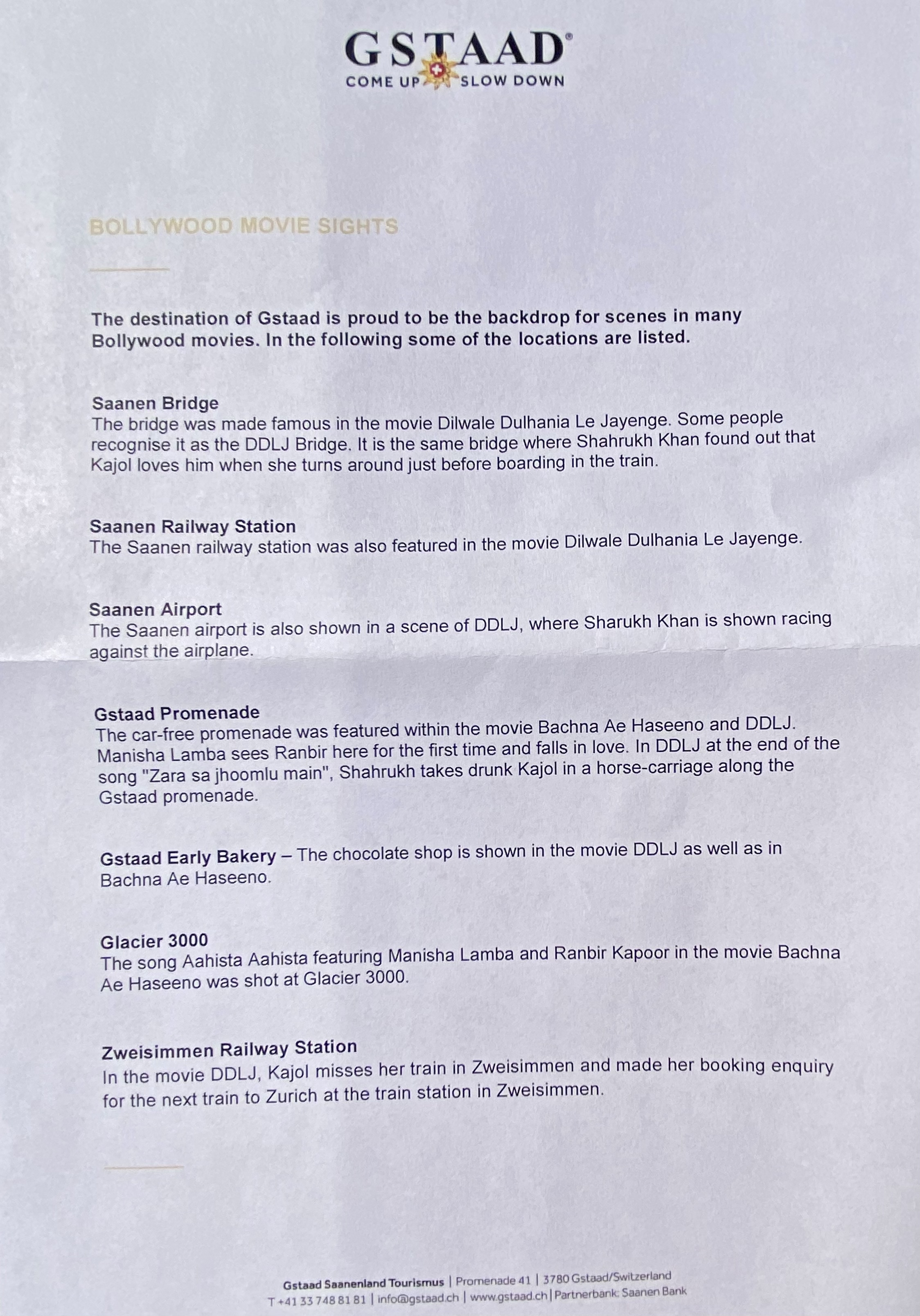 Gstaad & Saanen is famous for the shooting of many Bollywood movies particularly ”Diwale Dulhaniya Le Jayenge”.